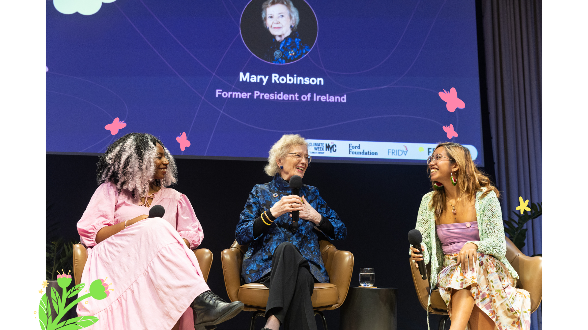 Following her stunning and heartfelt musical performance, which emphasized climate awareness and highlighted the beauty of our planet while calling for its urgent protection, Mary Robinson discussed with Mitzi Jonelle Tan and Dominique Palmer, climate activists and members of our Steering Committee, the importance of intergenerational dialogue in activism. She began by highlighting the urgency for faster progress in the climate movement, stating